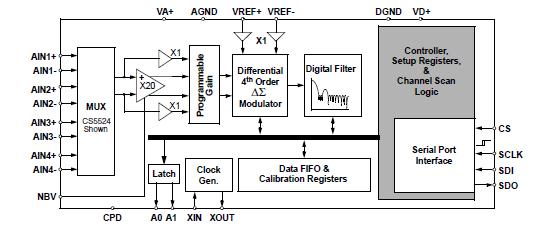 The CS5523-ASZ is a highly integrated ΔΣ analog-to-digital converter (ADC) which use chargebalance techniques to achieve 24-bit performance. The CS5523-ASZ comes as four-channel and include a low-input-current, chopper-stabilized instrumentation amplifier. To permit selectable input spans of 25 mV, 55 mV, 100 mV, 1 V, 2.5 V, and 5 V, the ADCs include a PGA (programmable gain amplifier). To accommodate ground-based thermocouple applications, the CS5523-ASZ includes a charge pump drive which provides a negative bias voltage to the on-chip amplifiers.
